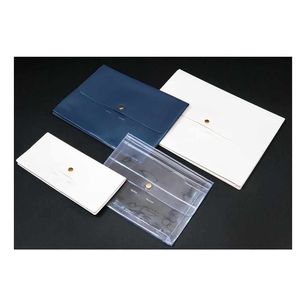 「LACONIC®ELEMENTS/エレメンツ」第一弾、全4サイズ展開のフランシス/ドキュメントケースの登場です。それぞれダイアリーやノートなどの各種サイズに対応し、一緒に持ち運びたいペンや付箋などの小物類もまとめてスマートに収納できます。ネイビーとホワイトはプライバシーを保護しつつも、フラップをめくると中身が確認できるクリア窓が付いており、ユーザビリティに配慮した設計になっています。また、スケルトンのクリア色については、中身を「見せて魅せる」と言ったファッション性を加味した、より個性を表現しながらの楽しみ方も味わえます。