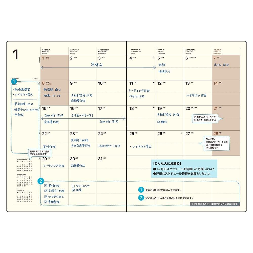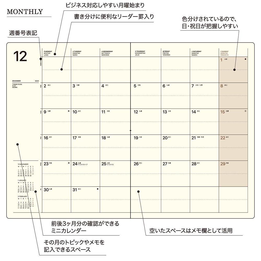 大判ならではの視認性の高さと書き込みやすさが特長の、見開き1ヶ月 / 6段表記の月間ダイアリー。