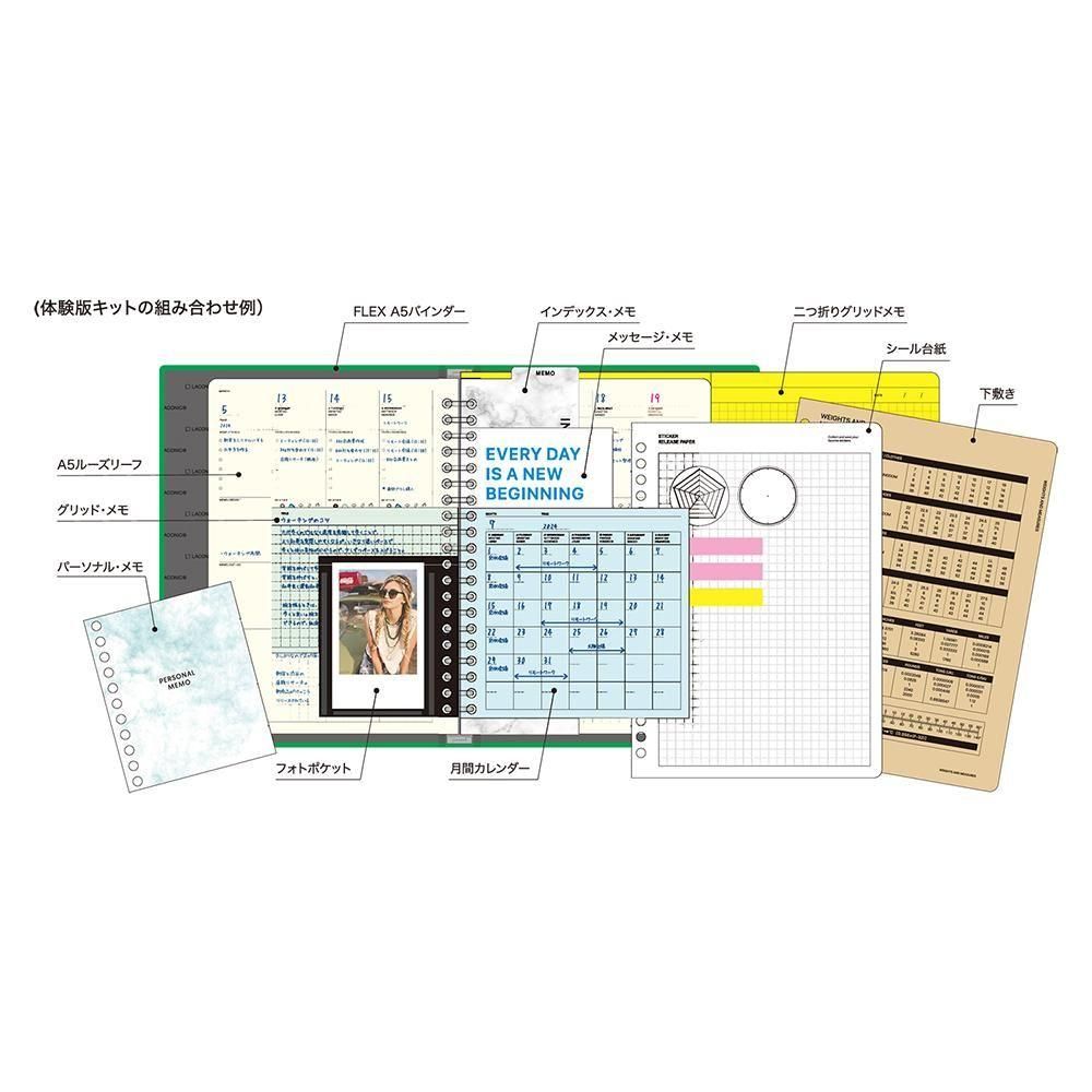 ラコニック・フレックスの魅力が詰まった体験版キットには、すべてのルーズリーフやエレメンツが入っていますので、