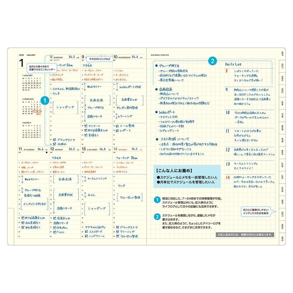 片面1週間のスケジュール管理+メモページを組み合わせた月ごとの管理に最適なインデックス付きの週間ダイアリー。