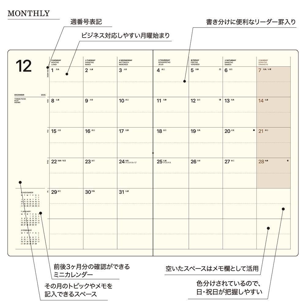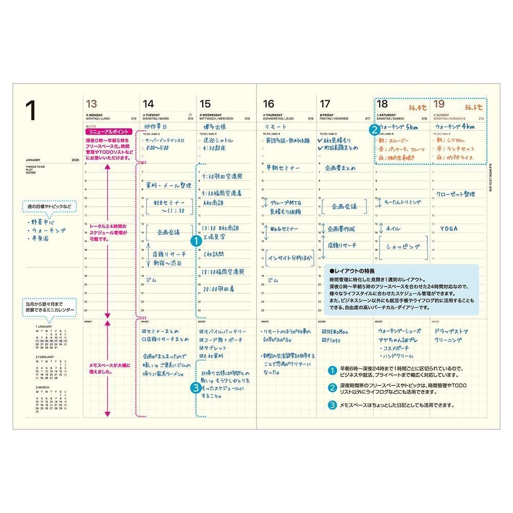 時間管理に特化したレイアウトに加え、マンスリーテーマやマージン罫入りのメモページを確保することで、ビジネスや受験、就活のスケジュール管理のみならず、体調管理や育児日記としても最適です。