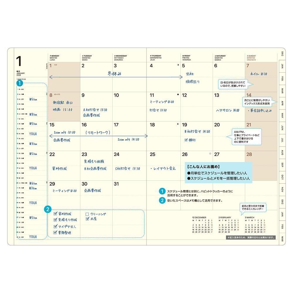 スケジュールとメモが月ごとに管理できるプレミアムなインデックス付きの月間ダイアリー。